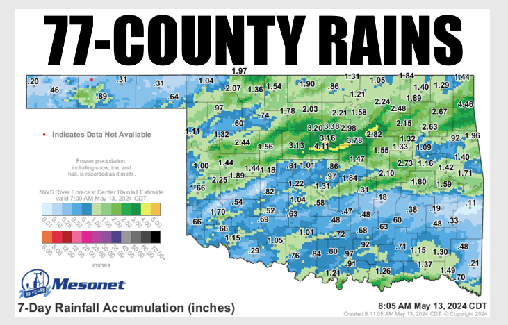 The Oklahoma Wheat needed a drink of water over the weekend, and a LOT of the state did get some rain. In fact, according to State Climatologist Gary McManus, 77 counties in Oklahoma did receive *Some* form of precipitation, but others didn’t get that much “77-county rains,” technically, that’s correct, although some got a lot, some unfortunately still got a little. But (and that’s a big “but”… you know who you are), like it says…everybody got at least a little. And we’ve