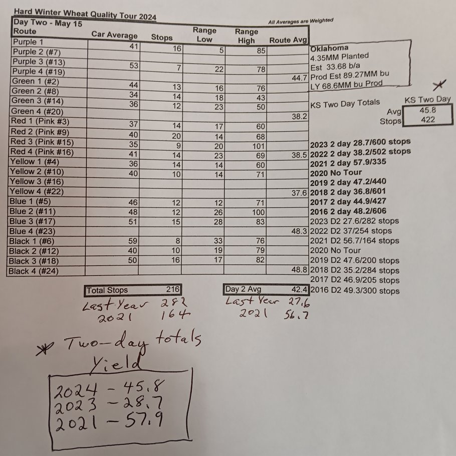 The two day totals on 422 stops here in 2024 is an average of 45.8 bushels per acre. K-State’s Romulo Lollato said the theme of the day was variability, even within fields. Groups saw a lot of drought stress and freeze damage, with some fields already being destroyed. Not as much stripe rust or Wheat Streak Mosaic Virus were observed on Wednesday, compared to Tuesday, likely due to drought conditions.