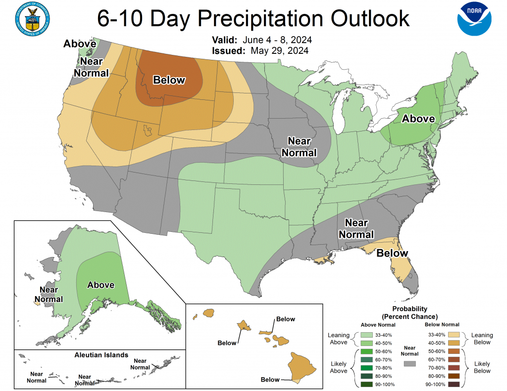 The Climate Prediction Center’s 6-10 day outlook (valid June 2–6, 2024) favors above-normal precipitation along much of the West Coast, from the southern Plains to the East Coast, and across much of Alaska, with below-normal precipitation across most of the interior West and Hawaii. Increased probabilities for above-normal temperatures are forecast for Hawaii and much of the contiguous U.S., while below-normal temperatures are likely across the state of Alaska and in parts of Georgia and South Carolina.