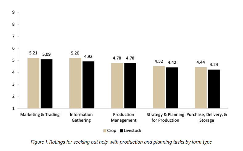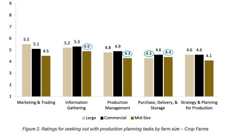 The ratings for production and planning tasks vary across different farm sizes. For example, large crop farms rated “Marketing and Trading” as the task they most seek help with, whereas commercial and mid-size crop farms rated “Information Gathering” highest. The task that large crop farms least seek help with is “Strategy and Planning for Production,” while mid-size crop farms least seek help with “Production Management” (Figure 2).