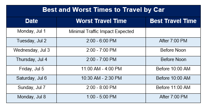 INRIX, a provider of transportation data and insights, says the worst times to travel by car before and on July 4th are between 2pm and 7pm. Drivers should hit the road in the morning, and travelers returning on Monday, July 8th should avoid rush hour traffic in the morning and afternoon.“Drivers in large metro areas can expect the worst traffic delays on Wednesday, July 3rd, as they leave town, and Sunday, July 7th, as they return,” said Bob Pishue, transportation analyst at INRIX. “Road trips over the holiday week could take up to 67% longer than normal. Travelers should monitor 511 services, local news stations, and traffic apps for up-to-the-minute road conditions.”