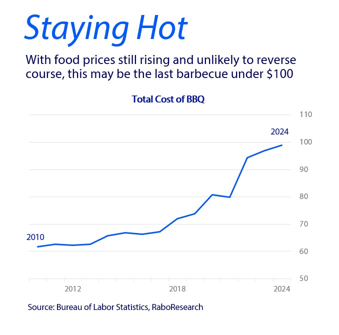 The Rabobank Barbecue Index assumes an average American BBQ situation—a mix of family and friends—on Fourth of July weekend. That includes 10 adults with each consuming the same amount of food and beverages. We assume each person will consume one cheeseburger with lettuce and tomato, one chicken sandwich with lettuce, tomato and a slice of cheese, two handfuls of chips, two beers, a soda and a few scoops of ice cream. As a means of comparison, the BBQ Index parallels the Bureau of Labor Statistics as a data source. We selected the monthly data series “average price index, U.S. city average.”