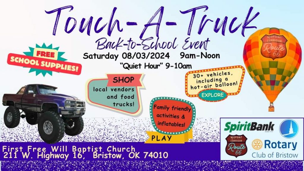 To help our local children with backpacks and basic supplies please make monetary or supplies donations at Spirit Bank in Bristow on Route 66. If you are interested in being a part of this event as a vendor, truck, or sponsor please text or call Kylie Shrewsbury at 918-948-3343 or email us at touchatruckbristow@gmail.com.
