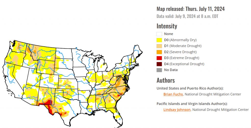 According to the latest U.S. Drought Monitor, the first landfalling tropical storm of the season came ashore in east Texas and brought significant precipitation to the area and up into the Ozark Plateau. Temperatures were cooler than normal over a large extent of the country from the Rocky Mountains and into the Plains and Midwest where departures from normal temperatures were 3-9 degrees below normal. Excessive heat dominated the West Coast where departures from normal temperatures over much of California were 12-15 degrees above normal. Many records were set, including 120 degrees in Las Vegas, beating the old record by 3 degrees, while Death Valley had 5 consecutive days with high temperatures over 125 degrees topping out at 129 on July 7. Near-normal to slightly above-normal temperatures dominated much of the East and Southeast. Along with the heat, much of the West was dry during the last week. Areas of the Plains recorded well above-normal precipitation with some areas receiving 400-800% of normal precipitation for the week. Spotty rains were common over the Southeast with a very typical summertime pattern of widely scattered thunderstorms accounting for most of the precipitation. The driest areas were from Mississippi and northern Alabama into Tennessee and the Mid-Atlantic. Portions of northern Illinois eastward into Ohio were also dry throughout the week.