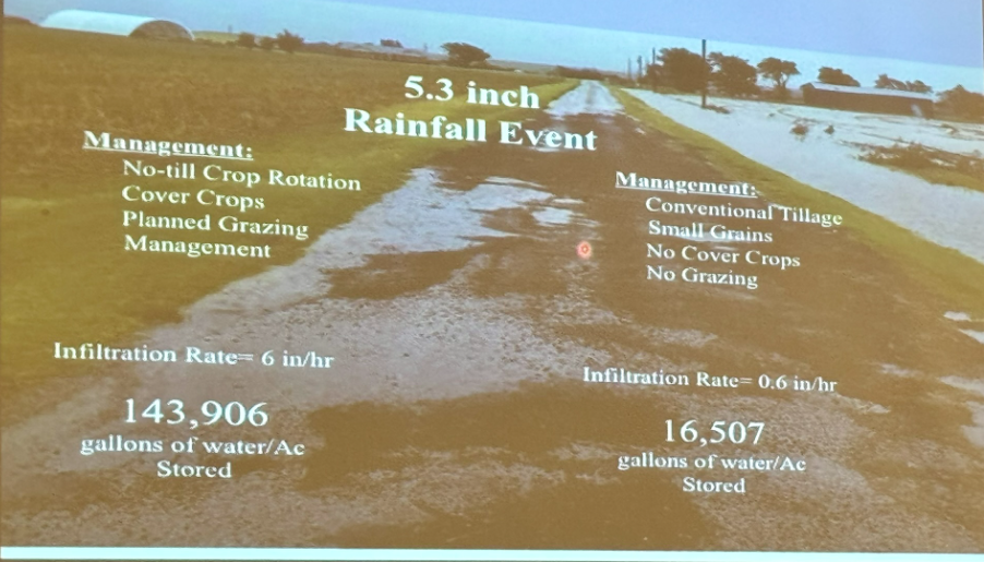 Increasing the water infiltration rate is not only important to soil health, but also to reduce the effects of flooding. “That’s really what we are trying to do is lessen the adverse effects of droughts and flooding; to mitigate that down to a flatter line between such extremes,” Emmons stated.