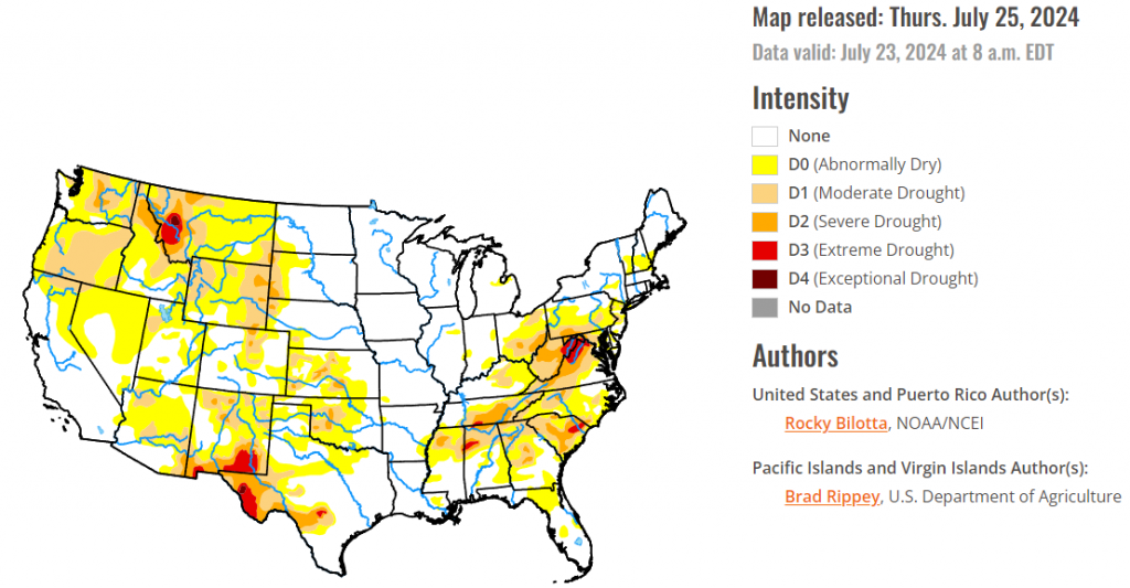 According to the latest U.S. Drought Monitor, over the past week, a major heatwave brought warmer-than-normal temperatures to much of the West, with departures ranging between 3 to 12 degrees F above normal across much of the region. Near-normal to cooler-than-normal temperatures were observed from the central Rockies to the Great Lakes, with departures ranging between 3 to 9 degrees F below normal. Precipitation varied across the contiguous U.S. this week. Monsoonal moisture brought heavy precipitation and flash flooding to parts of the Southwest, while a lingering frontal boundary brought daily thunderstorms, heavy rainfall and flash flooding across much of the Southeast and Mid-Atlantic. The most widespread improvements were made in the Southeast, as well as eastern portions of the Southwest and across much of western Texas, where above-normal precipitation amounts were observed this past week. Conversely, dry conditions resulted in degradations across much of Hawaii and the Pacific Northwest, as well as southern portions of the Northeast and in parts of the central Plains, and other parts of the West. Drought and abnormal dryness also expanded or intensified in the Ohio Valley, western High Plains, and in New England. In Hawaii, dry conditions coupled with warmer temperatures resulted in the expansion and intensification of drought across the state this week.