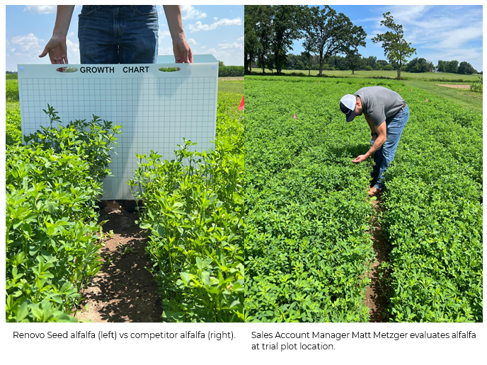 (BROOKINGS, SD, September 16, 2024) – Renovo Seed® will offer eight elite alfalfa varieties and three of their famous AlfaGrass mixes in their 2025 product lineup. The products, which are tested in multi-year, multi-harvest plots prior to release, are poised to fit the specific forage needs of farmers and ranchers. “We’re very excited about this year’s alfalfa and AlfaGrass lineup,” shared Justin Fruechte, Ag Product Expert for the brand. “It’s an interesting time in the alfalfa market. Many brands are backing away from, or even completely eliminating, their alfalfa offering. Renovo is making sure we have excellent options. We have been a steady alfalfa supplier for many years, and we’ll continue offering it for decades to come,” he continued. Renovo Seed invests many years into alfalfa trials, ensuring the varieties in their lineup can be trusted for quality forage and strong persistence. “I’ve seen a lot of alfalfa in my days, but I’ve rarely seen a seed company invest this much into their alfalfa vetting process. We take the time to make sure the Renovo Seed alfalfa varieties are top tier, no matter what your conditions are. Whether you’re in the western plains or the eastern corn belt, we have an alfalfa or AlfaGrass variety to fit your operation,” shares Matt Metzger, Sales Account Manager for Renovo Seed. The Renovo Seed alfalfa lineup offers a variety of products, including everything from a Fall Dormancy 3 option for areas with harsh winters, to a non-dormant alfalfa suitable for southern climates. With forage quality top of mind, Renovo Seed alfalfa and AlfaGrass mixes take yield and persistence to the next level. The 2025 Renovo Seed alfalfa lineup includes: