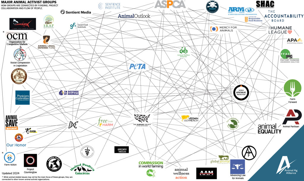 The Major Animal Activist Groups Web includes a selection of the most active or extreme groups involved with or connected to the vegan and animal rights movement. Collectively, these organizations bring in more than $800 million in revenue annually to use for anti-animal agriculture campaigns according to publicly-filed financial records. Notable additions to the web for 2024 include the Center for Responsible Food Business, which was founded by the former director of corporate engagement at The Humane League, and Pro-Animal Future, the organization campaigning for a processing plant ban in Denver, Co. and connected to Direct Action Everywhere. Other additions include Advancing Law for Animals, Animal Activism Mentorship, Animal Policy Alliance, Free from Harm, Pax Fauna, and Social Compassion in Legislation.