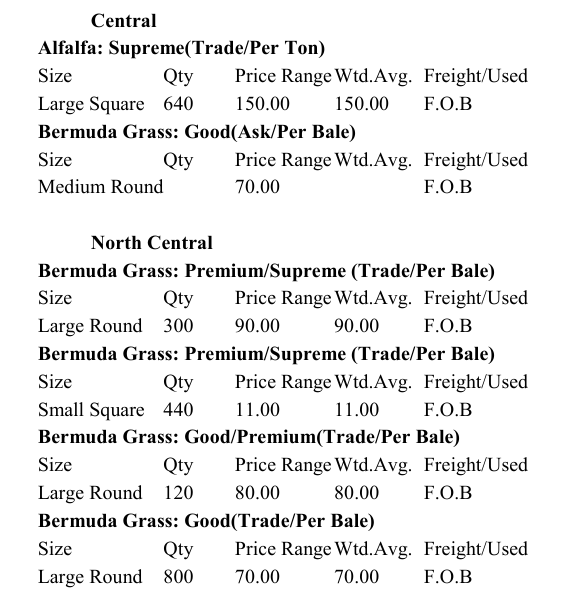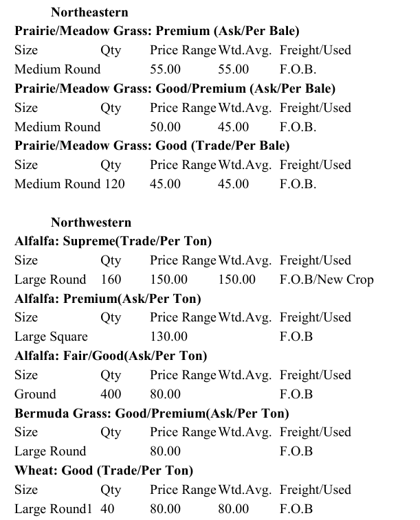 Trends: Alfalfa Large rounds & squares $130-$150 a ton – 2024 Grinding hay – No Trend