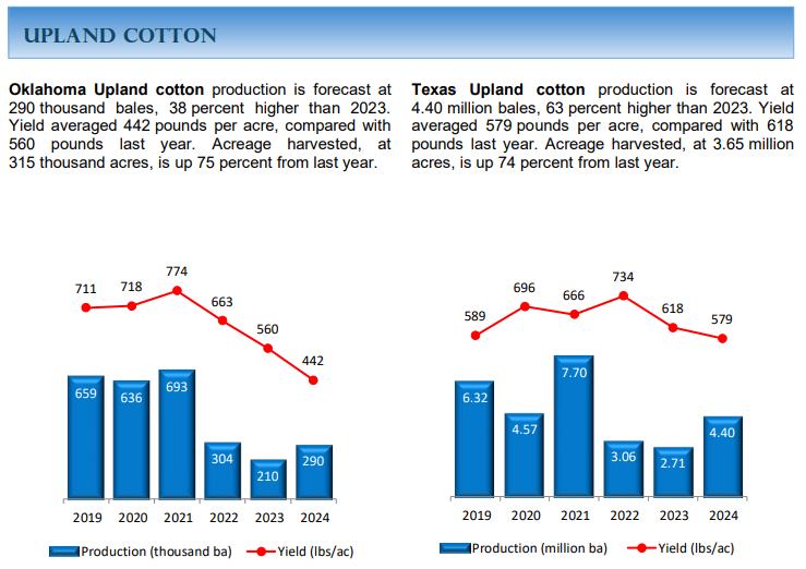 Oklahoma Upland cotton production is forecast at 290 thousand bales, 38 percent higher than 2023. Yield averaged 442 pounds per acre, compared with 560 pounds last year. Acreage harvested, at 315 thousand acres, is up 75 percent from last year.