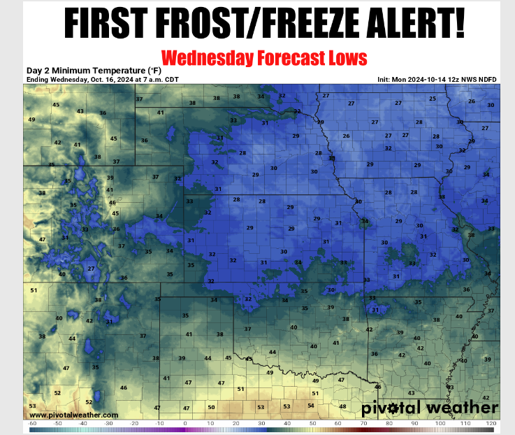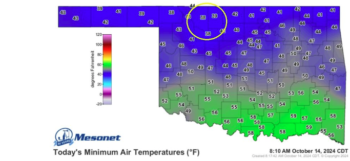 The Coldest air of the season will arrive on Wednesday morning, with a light frost and maybe even a light freeze possible. The Portions of the State in the possible Frost outlook for Wednesday Morning are the Alva-Enid-Stillwater-Tulsa area, while the “Freeze” portion would be Ponca City-Bartlesville. The rest of the state looks clear for now.