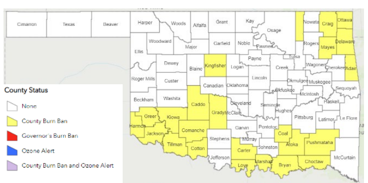 Burn Bans: Refer to: https://ag.ok.gov/divisions/forestry-services/ for the most current burn ban information and links to specific burn ban proclamations.