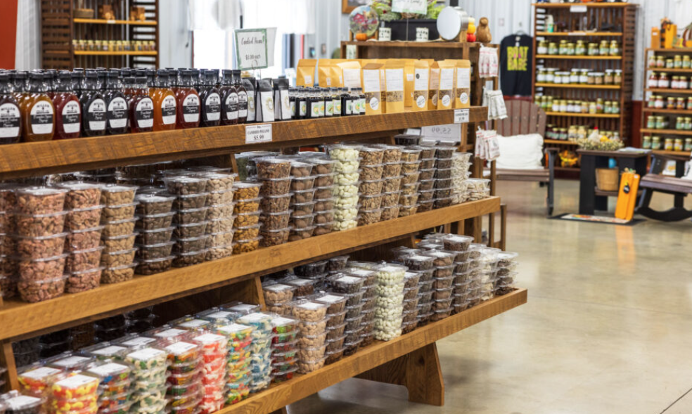 A sprawling storefront welcomes visitors, travelers and locals, enticing them to step inside the store, which features a wide array of pecans, candies, snacks, Made in Oklahoma products and more.
