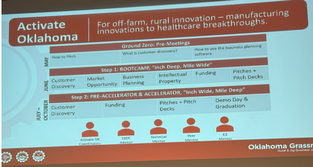 Activate Oklahoma is an Oklahoma Grassroots Rural and Ag Business Accelerator pipeline which is essentially a program designed to help startup companies reach profitability faster.
