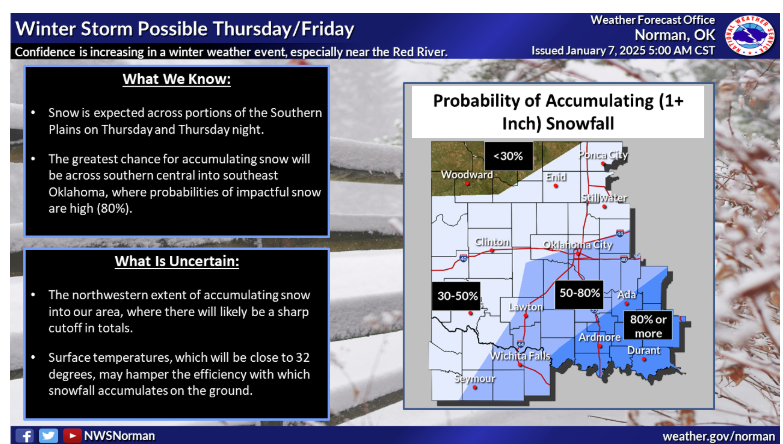 According to McManus, this week is going to stay on the cool side, “Northern Oklahoma go theirs yesterday, now the rest of the state gets to play later this week, most likely starting early Thursday into early Friday, and again most likely an I-44 to the south and east type of snowfall.” McManus said we aren’t exactly sure what this next storm might bring, but right now it looks like we will see some more snow in the state, “A winter storm watch has been issued for that area in SE OK where the 3-8 inches of snow is possible. Due to the uncertainty, it’s a watch thus far, but I’d expect to see a change to a winter storm warning if things continue on track as they are now. And we still can’t rule out things shifting north or south as we go forward. I don’t think we will see much of a spread vs. a shift, however.”