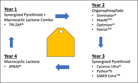 Ear tags are an effective method for control of adult horn flies and should be administered to the animals once the threshold of 200 flies per animal is reached. Most ear tags have an effective life of approximately 4 months, under ideal conditions. In the hot, Oklahoma summers, expect the lifespan of an ear tag to be 3 months or less. Waiting to tag animals until horn fly numbers reach the threshold of 200 flies per animal will help ensure that the ear tags are still effective once we reach peak fly season in mid to late summer. If horn flies are active: it’s never too late to tag, but it can be too early. Make sure to use a different chemical class than you did last year, to help slow the development of insecticide resistance. If picking a synthetic pyrethroid tag, choose one that is synergized, and contains piperonyl butoxide (PBO) as an active ingredient. A good, yearly rotation schedule for ear tags is shown below.