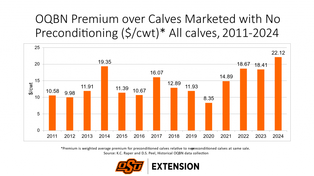 Oklahoma Quality Beef Network (OQBN) producers in 2024 were rewarded with the highest overall average premium in program history at $22.12/cwt (Figure 1). OQBN is a third-party certified VAC-45 preconditioning program offered through Oklahoma Cooperative Extension. Producers follow an OQBN calf health management protocol to qualify for certification and eligibility to market cattle through OQBN. Extension personnel provide guidance to producers and certification to potential buyers that protocols have been followed. OQBN premiums reported here are measured as the weighted average premium for OQBN VAC-45 calves relative to non-preconditioned calves of the same sex and weight class at the same sale.