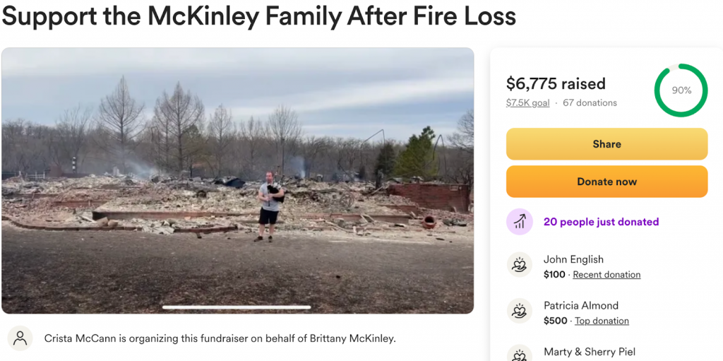 Help support the McKinley Family after the Stillwater fire: (Stillwater) Scott and Brittany McKinley lost everything when wildfires swept through Stillwater, OK, on March 14, turning their home to ashes just as their spring break with their two young daughters began. Known for their generosity and hospitality, they now need support as they navigate the challenges of rebuilding, replacing essentials, and recovering from this devastating loss. Andrew Turner, one of the fundraiser organizers, shared Scott is known for playing his bagpipes at funerals to soothe grief. In a recent Facebook video, Scott is seen playing the bagpipes in front of what used to be his home. You can also find additional GoFundMes for the Mckinley family here (Help GTOA Official Scott McKinley’s Family / Andrew Turner: (918) 724-4402) and here (Help support the McKinley Family after the Stillwater fire.)