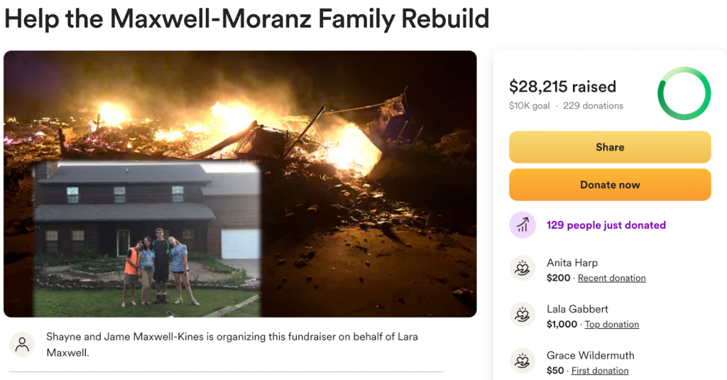 Help the Maxwell-Moranz Family Rebuild: (Stillwater,OK) The Maxwell-Moranz family lost their home and all their belongings in the Stillwater wildfires, escaping with only their lives. Now, after years of giving back to their community, Dr. Lara Maxwell, a dedicated OSU professor, and her husband, Dr. Moranz, who has supported local farmers and ranchers, need urgent support to secure housing, essentials, and begin rebuilding.