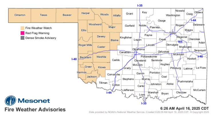 Outlook: We have reintroduced low potential for significant fire occurrence tomorrow (Thursday) back into the suite of products where the strongest alignment in the fire environment (fuels, weather and topography) will develop. The dryline is forecast to push into Western Oklahoma tomorrow (along and west of a line from Alfalfa to Harmon Counties. With green-up lagging in northwestern Oklahoma and the Oklahoma Panhandle, fire weather will support increased new wildfire occurrence potential and elevated large fire potential. Significant fire occurrence probabilities remain low, but merits mention.
