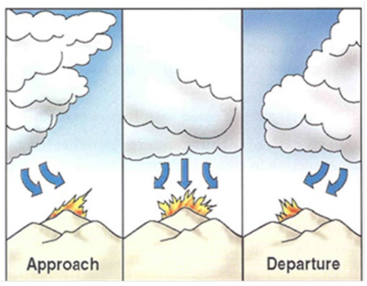 - Special Note to Firefighters: Thunderstorms that pass in the vicinity of an active fire have the potential to produce strong, gusty outflow winds that often result in erratic fire behavior. Firefighters should monitor fire environment conditions for the build-up of cumulus clouds, changes in wind speed and direction, and changes in fire behavior. Thunderstorms will produce outflow winds that generally intensify as a storm matures and will change the direction
