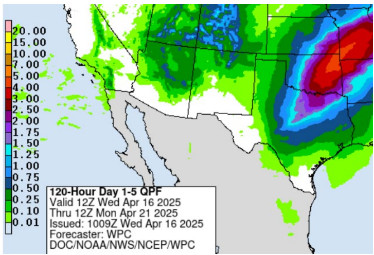 Rain chances build Friday and continue through the Easter weekend with optimism for statewide rainfall. Wetting amounts are expected for most of the state ,although we will be paying close attention to the Panhandle and far northwestern counties where lagging moisture has stalled green-up, holding available fuels on the landscape. The 5-Day Quantitative Precipitation Forecast (right) provides perspective on the rainfall expectation through the weekend.