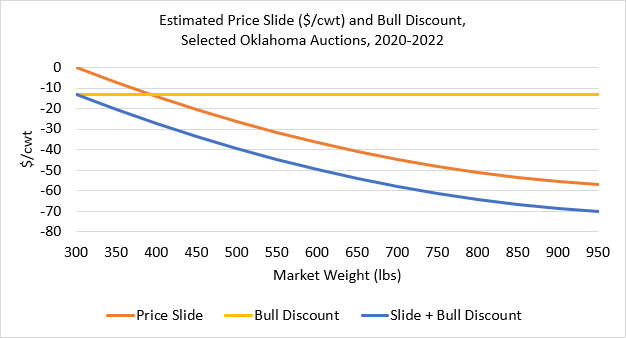Preliminary research with recent Oklahoma data indicates that the bull discount per cwt is stable across weight classes at -$13.22/cwt. At first glance, that may seem counterintuitive, as we might expect the bull discount to be larger for heavier animals based on the implications of later castration on health, performance, management, and carcass quality as those animals move through the beef supply chain. And actually, it is…when you look at it on a per head basis.