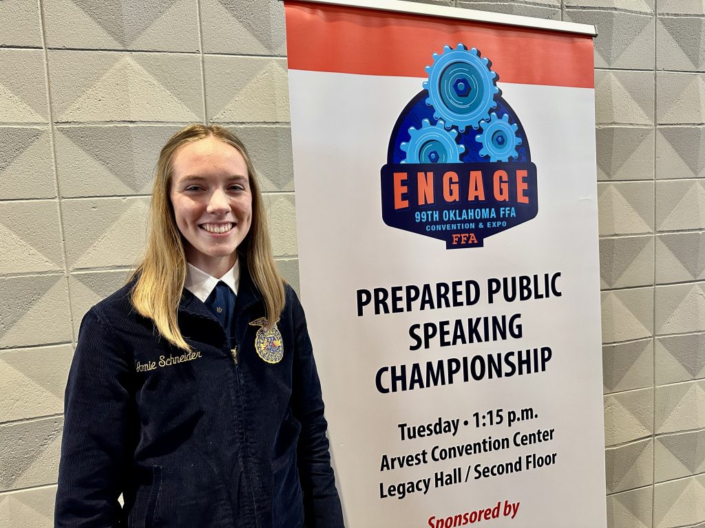 Oklahoma Farm Report’s Senior Farm and Ranch Broadcaster Ron Hays had the honor of helping judge the State Prepared Public Speaking contest at the 99th State FFA Convention and Expo on May 6 at the BOK Center. Once the decision was made, he scored an interview with the winning competitor, Annie Schneider of the Seiling FFA Chapter, where she serves as the Chapter President.