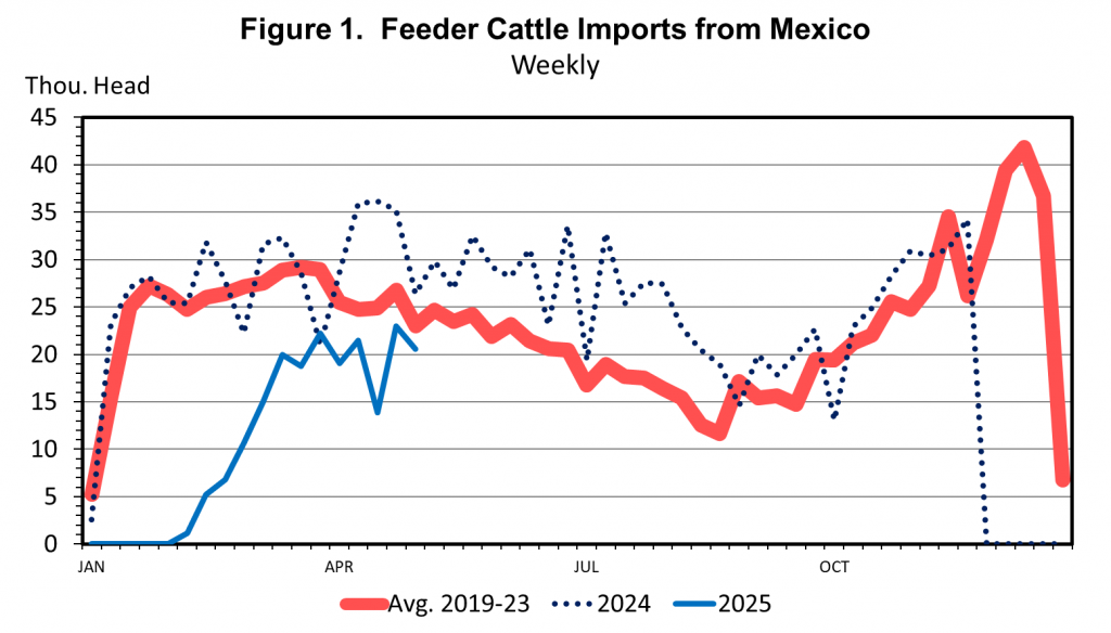 Continued detection of New World Screwworm (NWS) in southern Mexico, farther north than initially, has prompted USDA-APHIS to again close the U.S. border to imports of livestock. The border closed initially last November and reopened in early February after additional protocols and inspections were implemented. Thus far in 2025, a total of 197,844 head of feeder cattle have been imported since the border reopened, down 60 percent year over year for the year-to-date. In 2024, a total of 1.25 million head of feeder cattle were imported, with none in the last five weeks of the year.