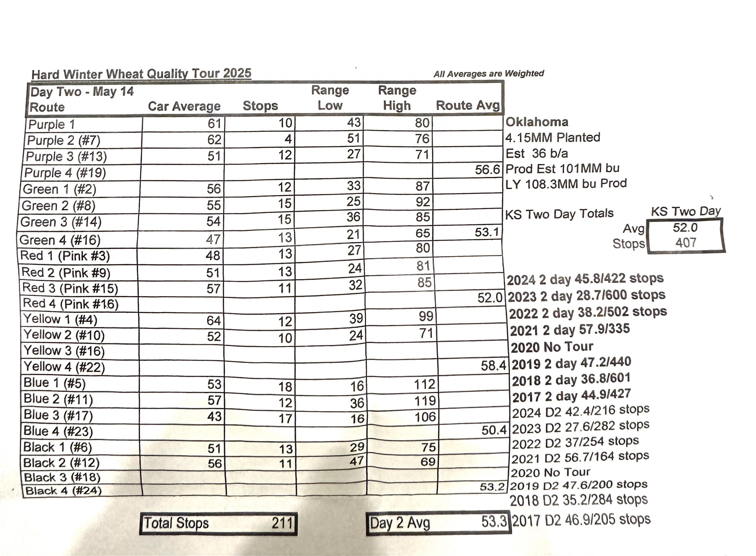 Day 2 of the Wheat Quality Council’s 67th Annual Hard Winter Wheat Tour concluded Wednesday, May 14, with a total weighted average yield estimate of 53.3 bushels per acre (bpa). Scouts assessed 211 wheat fields along six routes traversing western and southern Kansas from Colby to Wichita, along with some sampling in five select counties in northern Oklahoma.