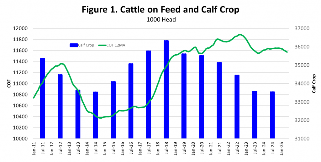 Figure 1 shows that the total calf crop has declined for the past six years, peaking cyclically in 2018. Feedlot inventories have remained relatively steady while the total calf crop declined. The current relationship between cattle on-feed and calf crop is a sharp contrast to a decade ago when feedlot inventories dropped as the calf crop decreased to cyclical lows. From 2012-2014, average feedlot inventories decreased by 984,000 head. Since the peak in 2022, average feedlot inventories have fallen by just 315,000 head and have varied by a scant 94,000 head in the past 24 months.
