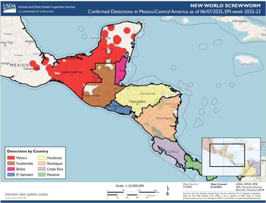 One glimmer of hope is that the NWS population seems to have stalled its northward progress for the past five or six weeks. “That’s not because it is naturally stalled out,” Weinheimer clarified. “That is because of the very intentional effort of USDA and the production of the sterile flies in that COPEG plant that are all being dispersed on the frontline of that fly line down there in Southern Mexico.”