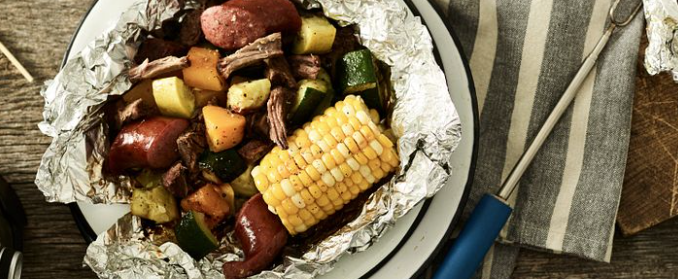 - Place a 12″ x 12″ square of heavy-duty aluminum foil down on work surface. Add 1/4 of beef and vegetable mixture to center of foil. Fold right and left edges in and roll together to close. Fold top and bottom edges in and roll to close package. Repeat with remaining mixture for a total of 4 packets.