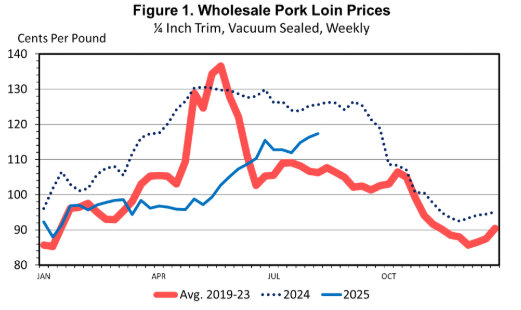 Beef prices are record high and there is lots of discussion about whether that can be sustained. However, it seems that changes in pork and poultry prices are having relatively little impact on beef demand. Figure 1 shows that pork loin prices have been relatively weak in 2025. Ham prices have been close to year-earlier levels so far this year with bellies (bacon) strong as always.