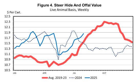 Beef by-products (or drop credit) have remained relatively steady in 2024 and 2025, down from previous years. The steer by-product value has averaged $11.59/live cwt. of fed cattle in 2025. This is down from nearly $14/live cwt. in 2022. Historically, hides made up the biggest component of the many items included in by-product values. However, hide values are very low worldwide. Tallow has been a larger component of by-product values recently, driven by biodiesel demand. It is noteworthy that by-product values have not kept pace with higher fed cattle prices. Historically by-product values were nearly 10 percent of live fed cattle prices but have averaged just 5.3 percent of fed prices in 2025 and most recently are less than five percent.