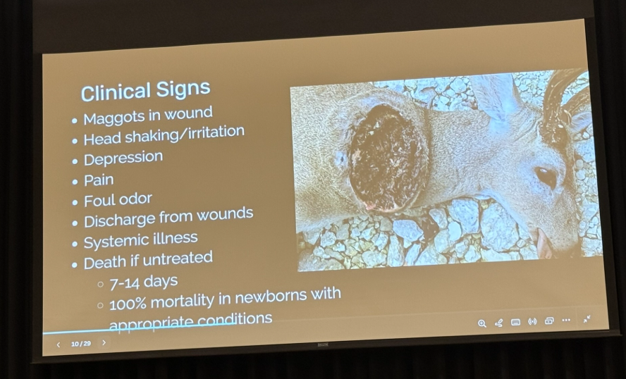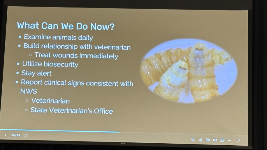 While there have been no confirmed reports of New World screwworm in the United States, Dr. Biggs noted that a recent detection in Veracruz, Mexico, has raised serious concerns. The location is approximately 370 miles from the Texas border, which she described as “a trailer ride away.” Unlike common flies that feed on dead tissue, screwworms lay eggs that turn into maggots that consume live flesh. This is a threat to all species, including livestock, wildlife, and humans. An infestation left untreated can be fatal to an animal within about two weeks. Dr. Biggs recommends that producers with any concerns about maggots burrowing into an animal’s open wounds immediately contact their veterinarian, as this is a reportable disease.