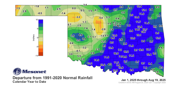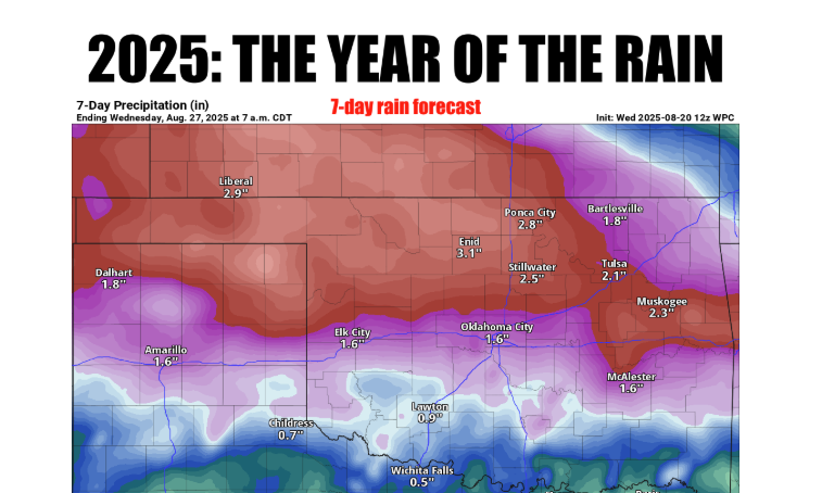 This upcoming weather pattern also comes on the heels of an already historically wet year for Oklahoma. According to McManus, the state is already in the “top-10 wettest Jan. 1 through Aug. 19 periods on record for at least the last 100 years, based on our statewide average rainfall.” The addition of another “blast of heavy rains” early next week will only solidify this record.