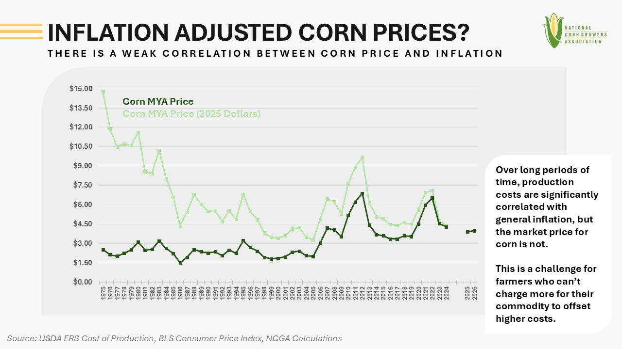 One of the challenges of farming is that production costs are significantly correlated with general inflation over long periods of time, but the market price for corn is not.