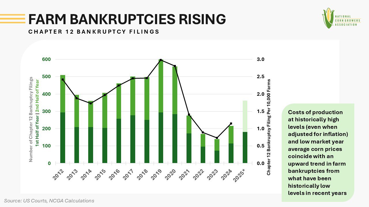Lower government payments in recent years paired with declining prices and sustained high costs, even when adjusted for inflation, coincide with the rising trend in Chapter 12 bankruptcies from the low point in 2023. In 2024, there were 216 Chapter 12 Bankruptcy filings. This was up from 139 in 2023 and broke what had been a downward trend since 2019. In the first half of 2025 there were 181 Chapter 12 Bankruptcy filings, well ahead of 115 at the same point in 2024, signaling growing farm financial pressures.
