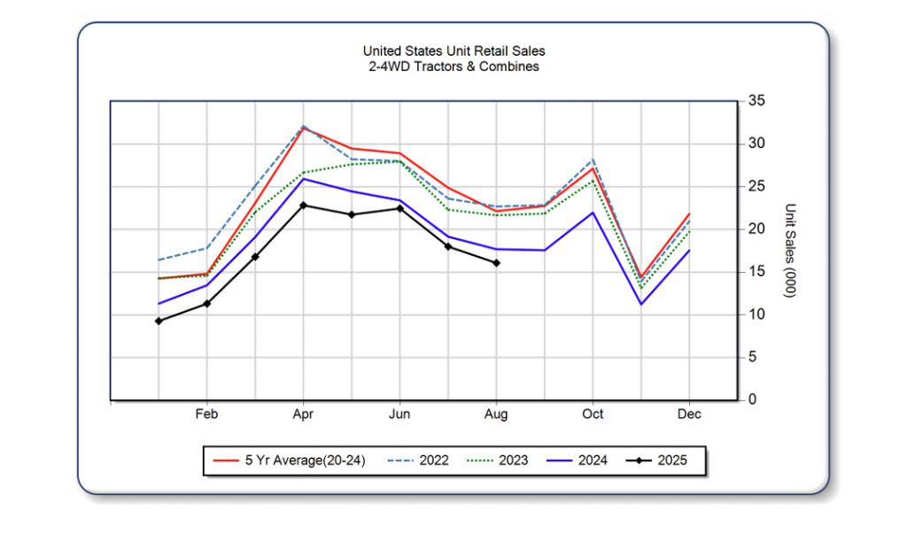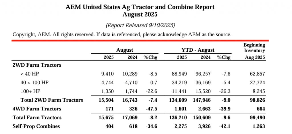 U.S. sales of combines fell 34.6% while sales of agricultural tractors dropped 8.2% in August 2025 compared to the year before.