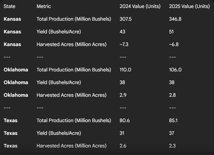 - Production: Overall winter wheat production saw a small decline, dropping from 110 million bushels (2024) to 106 million bushels (2025).