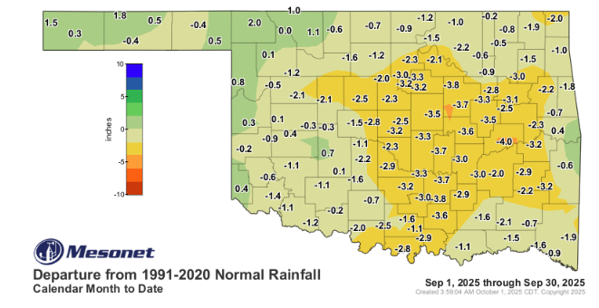The impressive, soaking rains of August failed to materialize through much of September. Rainfall deficits of 2–4 inches became common across large swaths of the state. Central Oklahoma fared the worst, recording a deficit of 2.87 inches, marking its eighth-driest September on record.