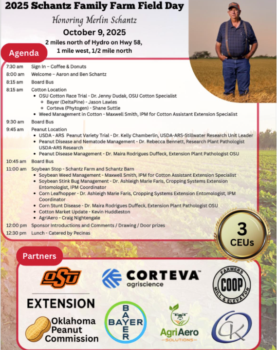 The tour will feature three stops, highlighting key research and management strategies for cotton, peanuts, and soybeans. The first stop will be a cotton variety trial that includes an examination of “non Roundup cotton” and features OSU Cotton Specialist Jenny Dudak.