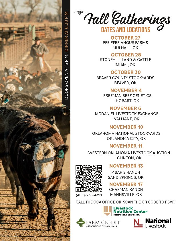 Fall Gatherings provide OCA members an opportunity to fellowship with area cattlemen in a casual atmosphere while gaining tips on how to protect our livelihood and enhance production practices. In an effort to recruit new OCA members, we encourage members to invite friends, family and neighbors. Doors open for vendor and sponsor visitation at 6:00 pm and the program begins with a delicious BEEF meal at 6:30 pm. During the meeting we will hear from sponsors followed by industry updates from the Oklahoma Beef Council and the Oklahoma Cattlemen’s Association. To RSVP for a upcoming fall gathering near you, please click the button below or call the OCA office at