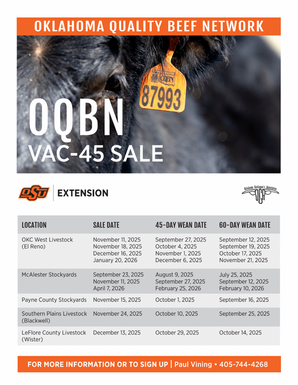 The Oklahoma Quality Beef Network (OQBN) is a joint project of the Oklahoma Cooperative Extension Service and the OCA. OQBN is a network of beef producers, educators, veterinarians, and industry professionals committed to increasing producers’ access to value added marketing opportunities and improving the quality of cattle produced in Oklahoma by increasing communication between all segments of the beef industry.