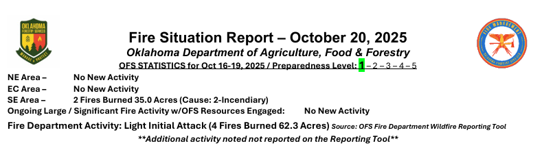 - Eastern Oklahoma: Having received the most beneficial rainfall, this region is at a lower risk. However, as fuels continue to dry today, new wildfires are still possible, particularly in grassy areas.