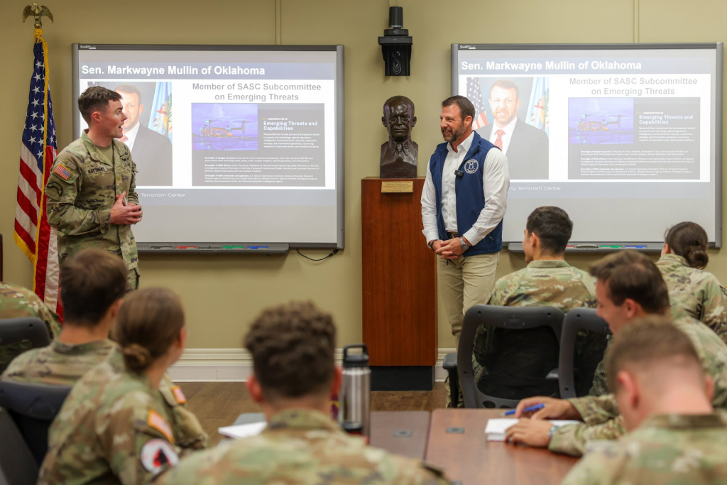 On Friday, U.S. Senator Markwayne Mullin (R-OK) visited the United States Military Academy at West Point where he met with Superintendent Lieutenant General Steven Gilland, toured various facilities, ate lunch with Oklahoma Cadets, and spoke to class SS465 – Terrorism: New Challenges.
