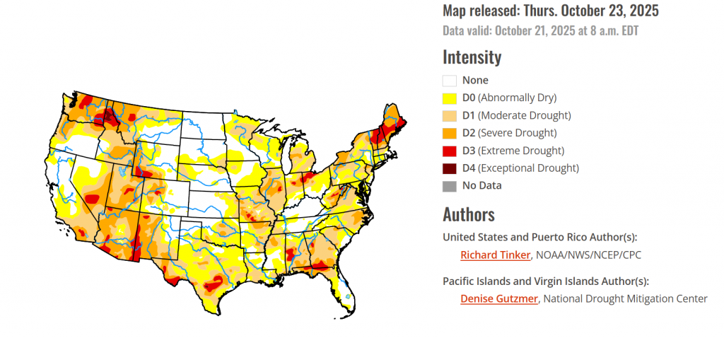 Recently, precipitation has been spatially variable across the Contiguous U.S. (“Lower-48”). Over the past 30 days, heavy precipitation (4 to locally over 8 inches) fell on parts of central and southern New England, the interior Northeast (especially eastern New York state), the Ohio Valley (particularly northern Kentucky and adjacent areas), eastern South Carolina, eastern Florida, parts of the Tennessee and adjacent Mississippi Valleys, isolated sites in the central Plains, the higher elevations in the Rockies, central Arizona and other scattered locations across the Southwest, parts of the Great Basin, portions of California (where such amounts are unusual this early in the wet season), and the Pacific Northwest (where these amounts are not unusual). In stark contrast, an inch or less of precipitation has been noted in the desert Southwest and lower elevations across the interior West, most of the central and southern Plains, the northern Great Plains, the northwestern Great Lakes, portions or northern and western Florida, and some interior sections of the Southeast and Mid-Atlantic region. Given the regional variability, there were a lot of changes in the Drought Monitor this week, with large parts of the West, much of the Ohio and middle Mississippi Valleys, and scattered locations across northern Mississippi, the Eastern Great Lakes, and the Northeast. At the same time, conditions have deteriorated across much of the southern and south-central Plains, the South Atlantic region from interior Georgia through eastern Virginia, southern parts of the Lower Mississippi Valley, and scattered areas across the rest of the Southeast, the Mid-Atlantic region, the Northeast, the Upper Mississippi Valley, and the northern Plains. In sum, the array of improvements and deterioration incorporated into this week’s Drought Monitor resulted in slight declines in overall coverage of the various drought severity levels across the Lower-48. Abnormally dry or worse conditions cover 72 percent of the country, down from 74 percent last week. About 21 percent of the country is experiencing Severe Drought or worse (D2-D4), down slightly from 23 percent last week. For the 50 states plus Puerto Rico in total, coverage of abnormally dry or worse conditions fell from 62 to just under 60.5 percent.