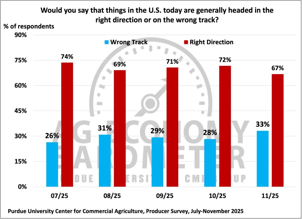 Recent barometer surveys have included two questions that focus on farmers’ attitudes regarding 2025’s policy shifts. A majority of respondents, 59% in November and 58% in October, said they expect that use of tariffs by the U.S. will ultimately strengthen the agricultural economy. However, that is lower than last spring, when 70% of respondents said they expected tariffs to strengthen the agricultural economy in the long run. More producers in recent months reported being uncertain regarding the long-run impact of the U.S. tariff policy. In October and November, 16% and 17% of survey respondents, respectively, said they were uncertain about the impact that tariff policy will have, roughly double the 8% of respondents who felt that way in April and May. Meanwhile, two-thirds (67%) of farmers in the November survey said the U.S. is headed in the “right direction”, down from the 72% who felt that way in October.