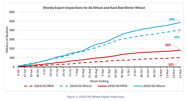 Export inspections picked up a bit to close out November. Figure 2 shows wheat inspections for the current and last marketing years. Wheat inspections for week ending November 27 came in at 14.1 million bushels. While slightly down from the 17.6 million bushels recorded on November 20, the last two weeks are above the ten million bushel a week pace produced over the previous month. Inspections need to average a little over fifteen million bushels a week for the remainder of the marketing year to hit USDA’s 900-million-bushel forecast. At present, there is not an expectation of